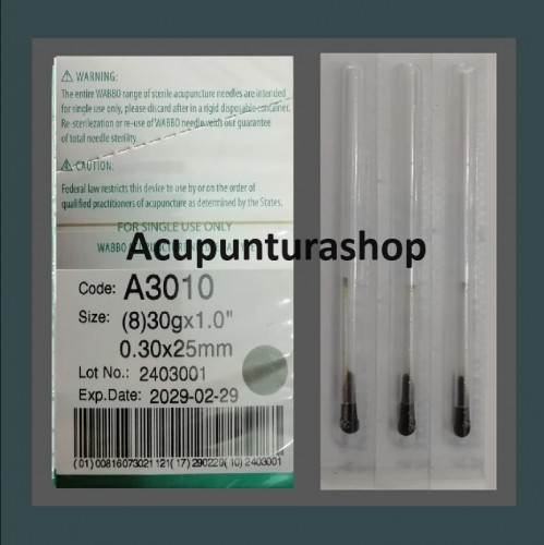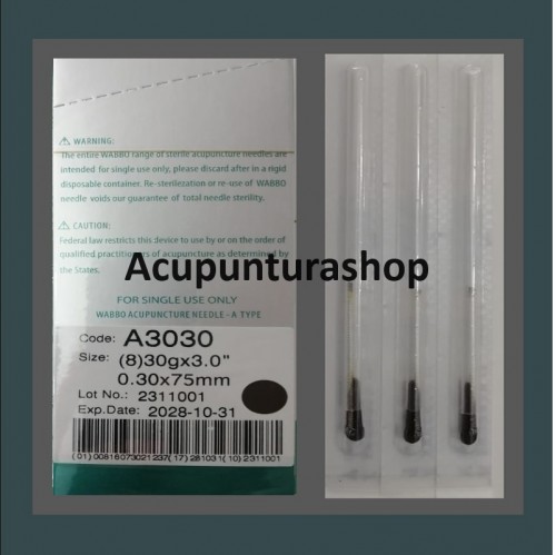 Agujas de Acupuntura en baño de acero CAJA CON 100 PIEZAS (una aguja por tubo). 30G x 3.0cum 0.30mm x 75mm