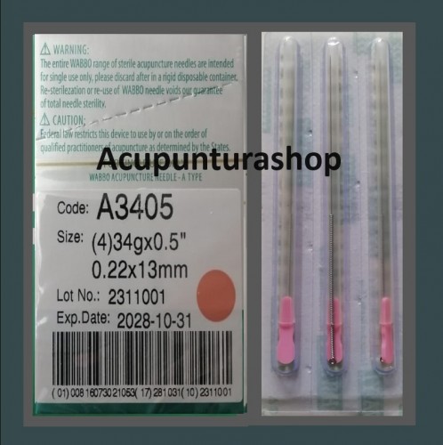 Agujas de Acupuntura en baño de acero CAJA CON 100 PIEZAS (una aguja por tubo). 34G x 0.5cum 0.22mm x 13mm