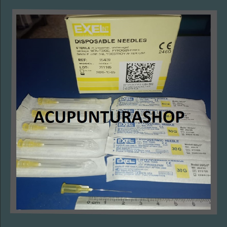 Caja con 100 agujas hipodérmicas estériles desechables para la aplicación de la mesoterapia.