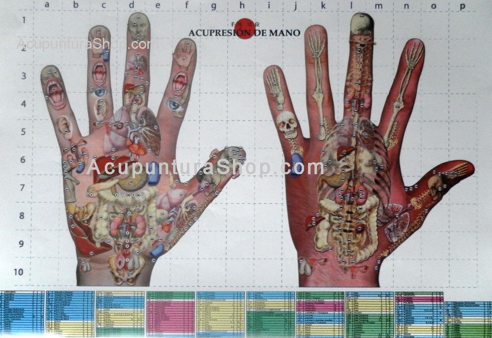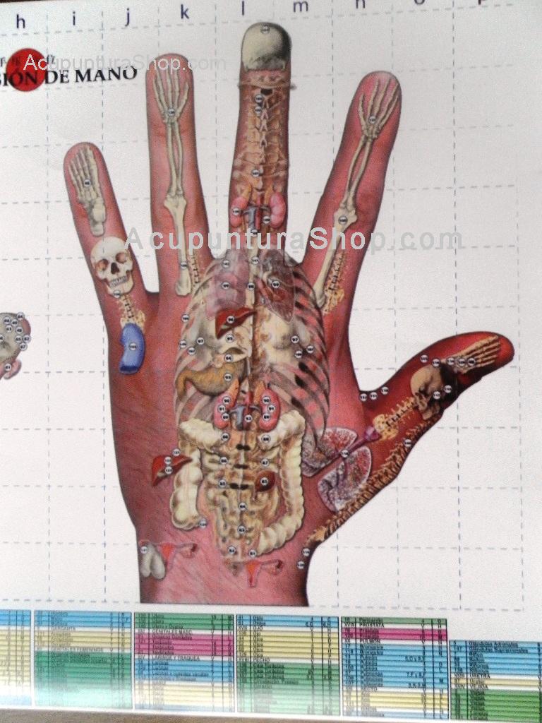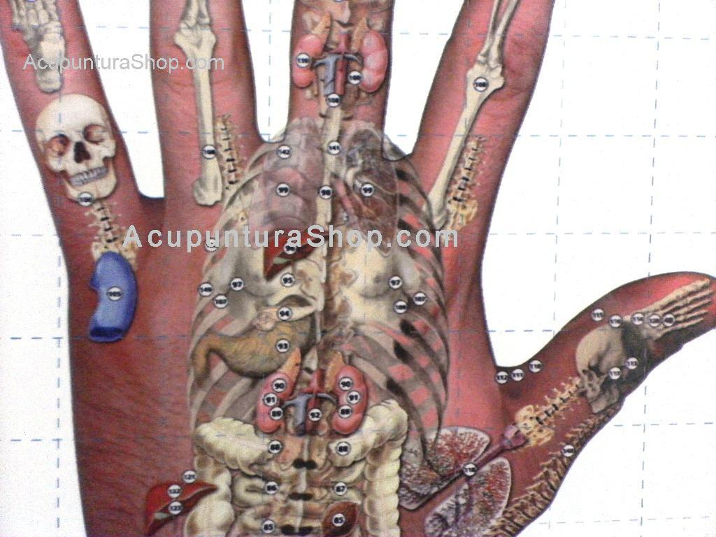 Esta lámina presenta todos los puntos de acupresión de ambas manos con coordenadas para su fácil localización.