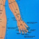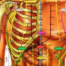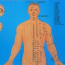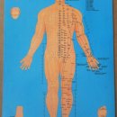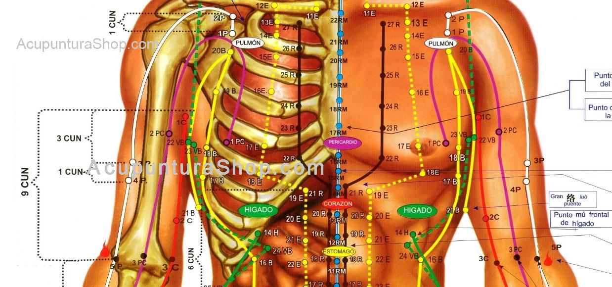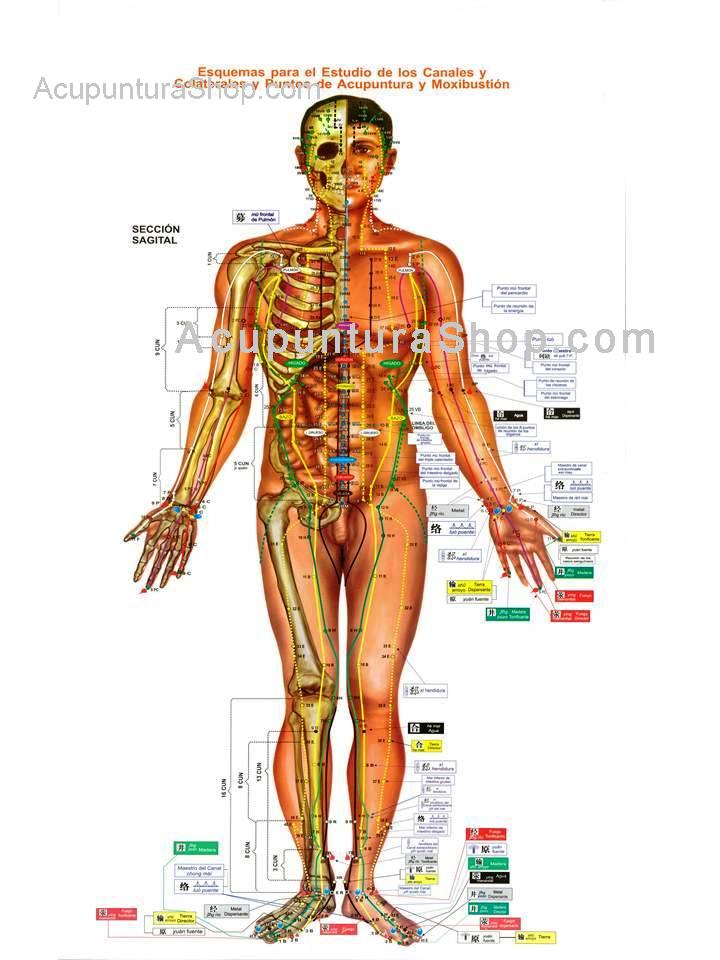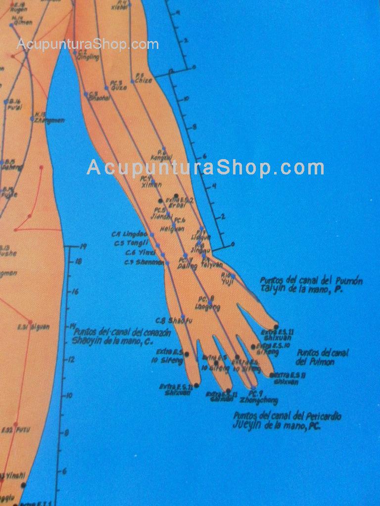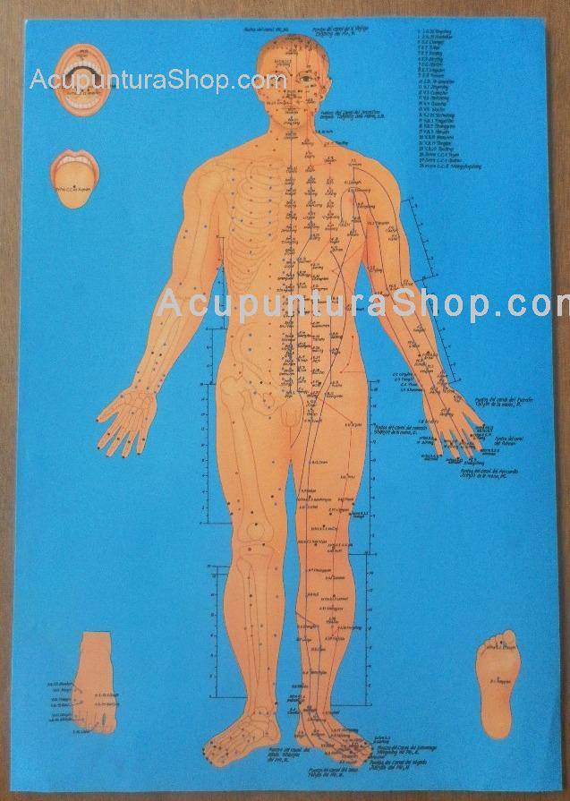 Esta lámina presenta la localización de puntos acupunturales en el cuerpo humano en posición frontal.