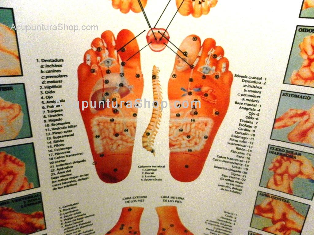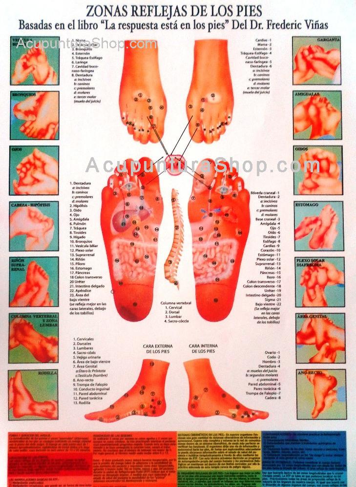 En esta lámina se presentan las zonas reflejas de los pies basadas en el libro "La respuesta está en los pies" del Dr. Frederic Viñas para dar un masaje reflexológico podal.