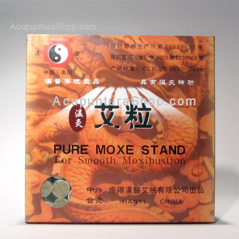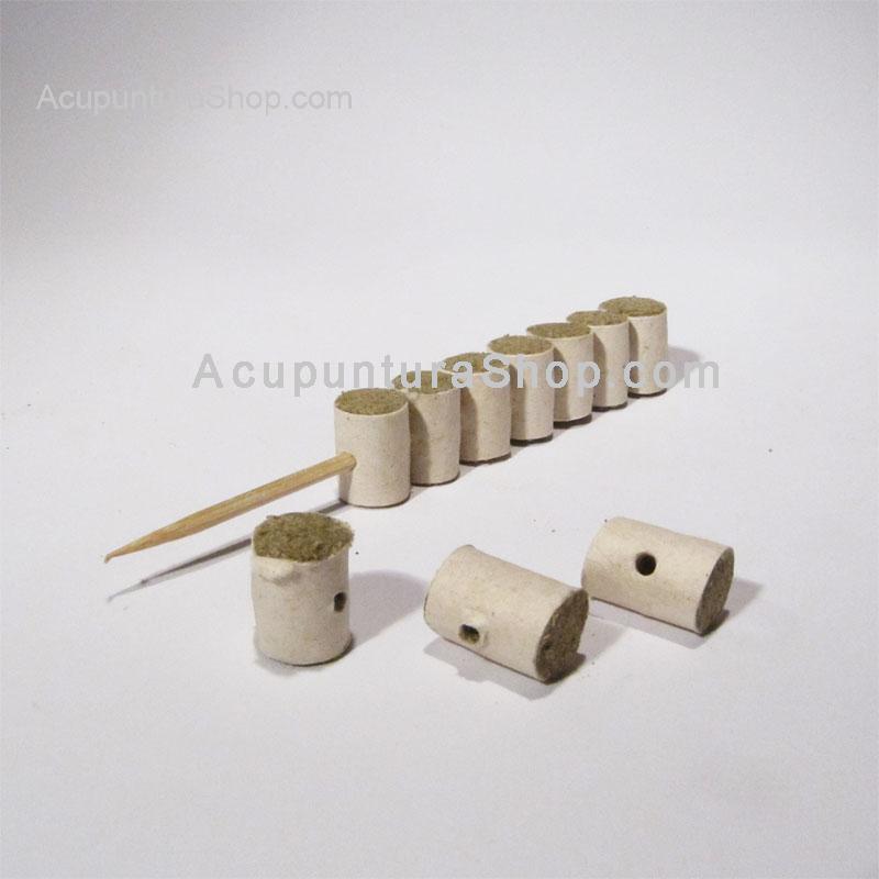 Moxa pura de alta calidad, se presenta comprimida y envuelta en papel en cilindros de 1.5cm de largo x 1.14cm de diámetro. Estos cilindros de moxa se pueden insertar en el mango de metal de la aguja de acupuntura. La moxa viene montada en 20 palillos de madera cada uno con 10 cilindros de moxa.