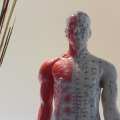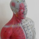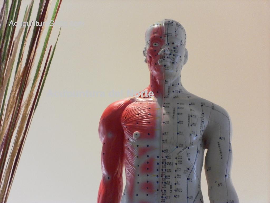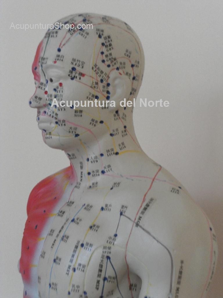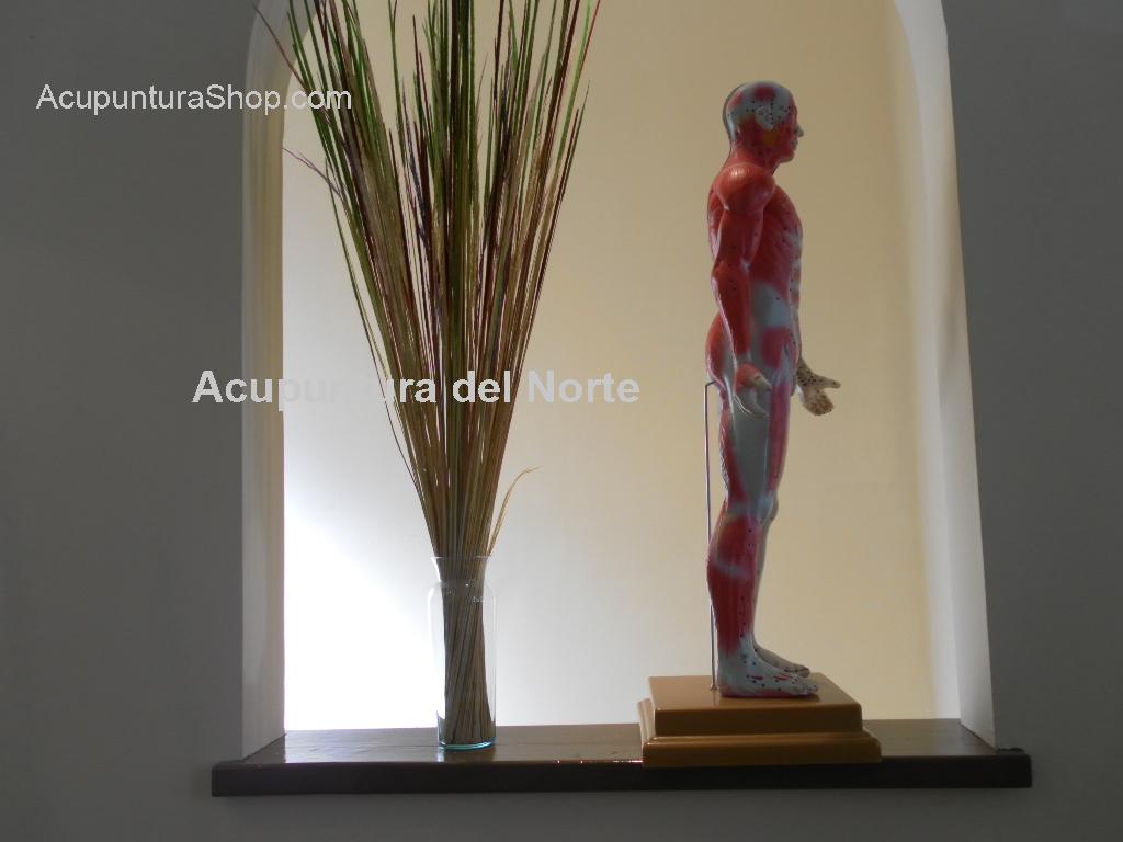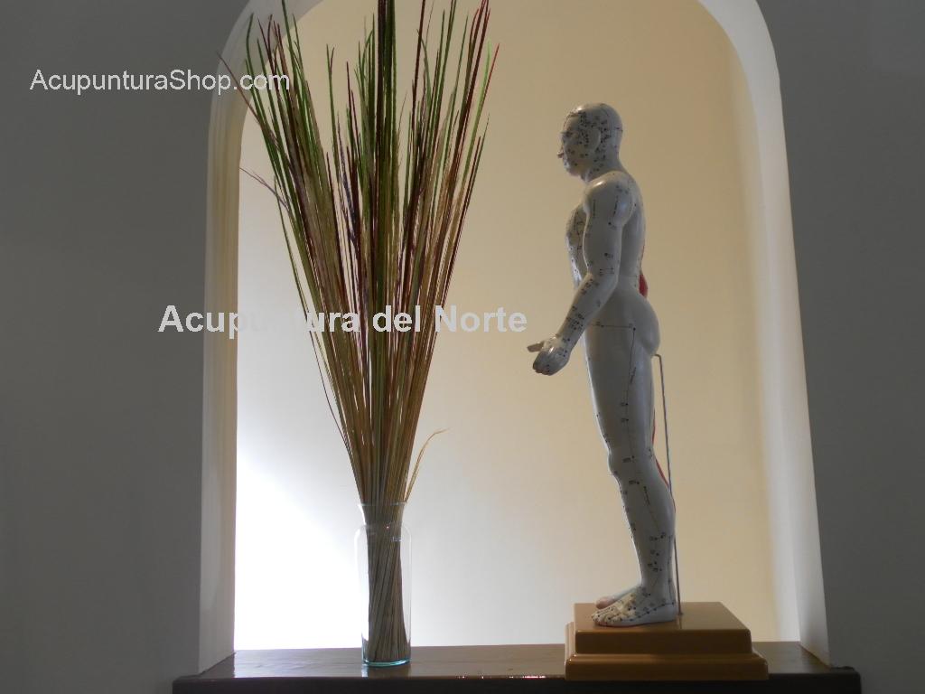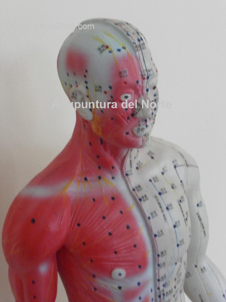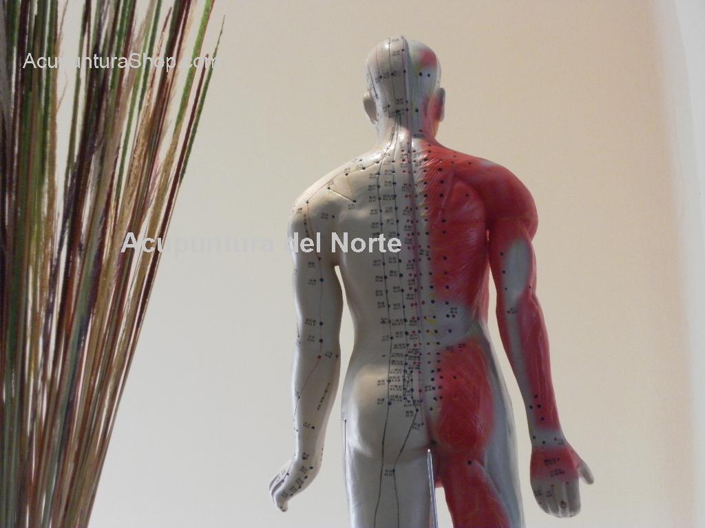 Modelo plástico masculino de resina a escala, mide 85cm de alto, muestra detalladamente los canales acupunturales con sus puntos.