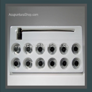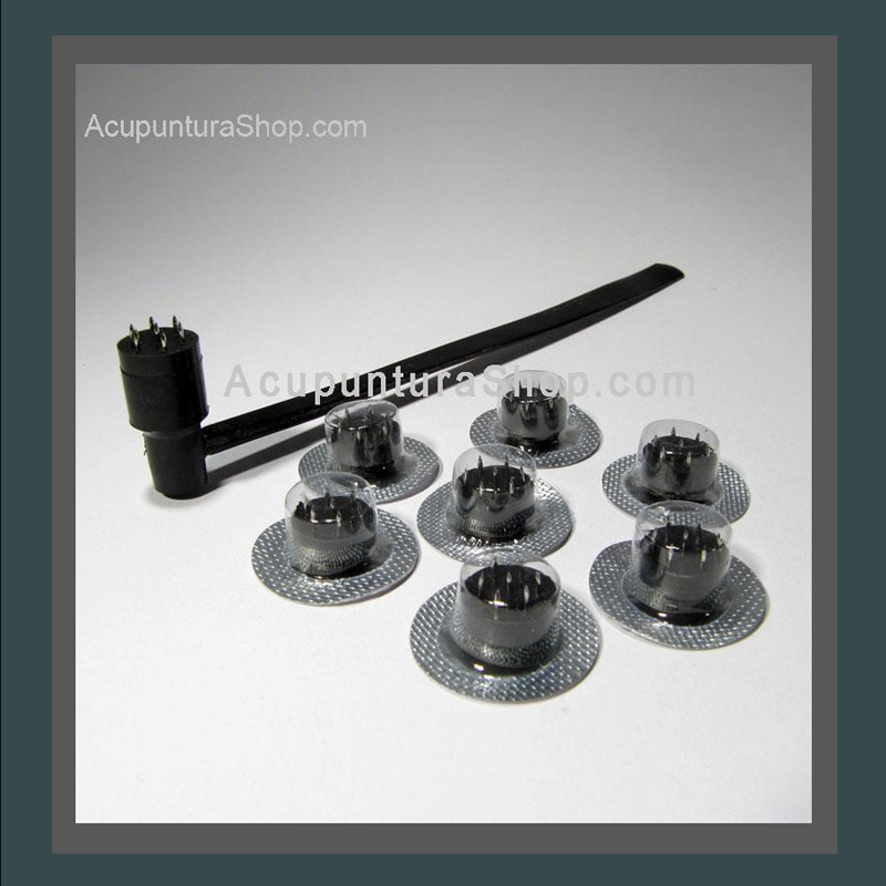 Martillo de plástico flexible y ligero, económico y fácil de usar, su cabeza consta de 7 pequeñas agujas distribuídas en un círculo, colocadas así para la estimulación de la piel.