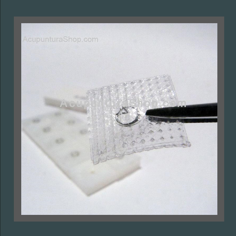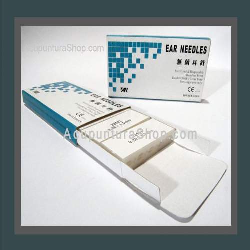 Caja con 100 Tachuelas auriculares con parche adhesivo cuadrado.